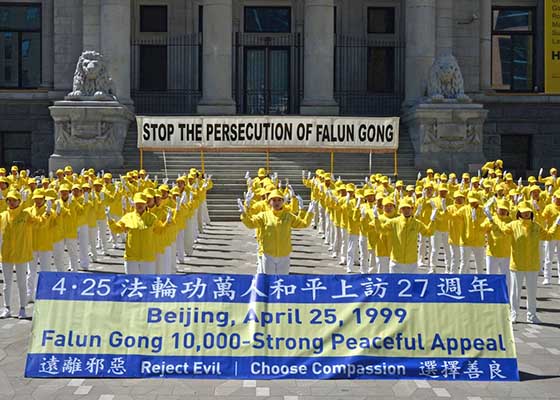 四月二十五日,温哥华法轮功学员在艺术馆北侧广场举行纪念“四·二五”和平上访二十七周年集体大炼功活动。