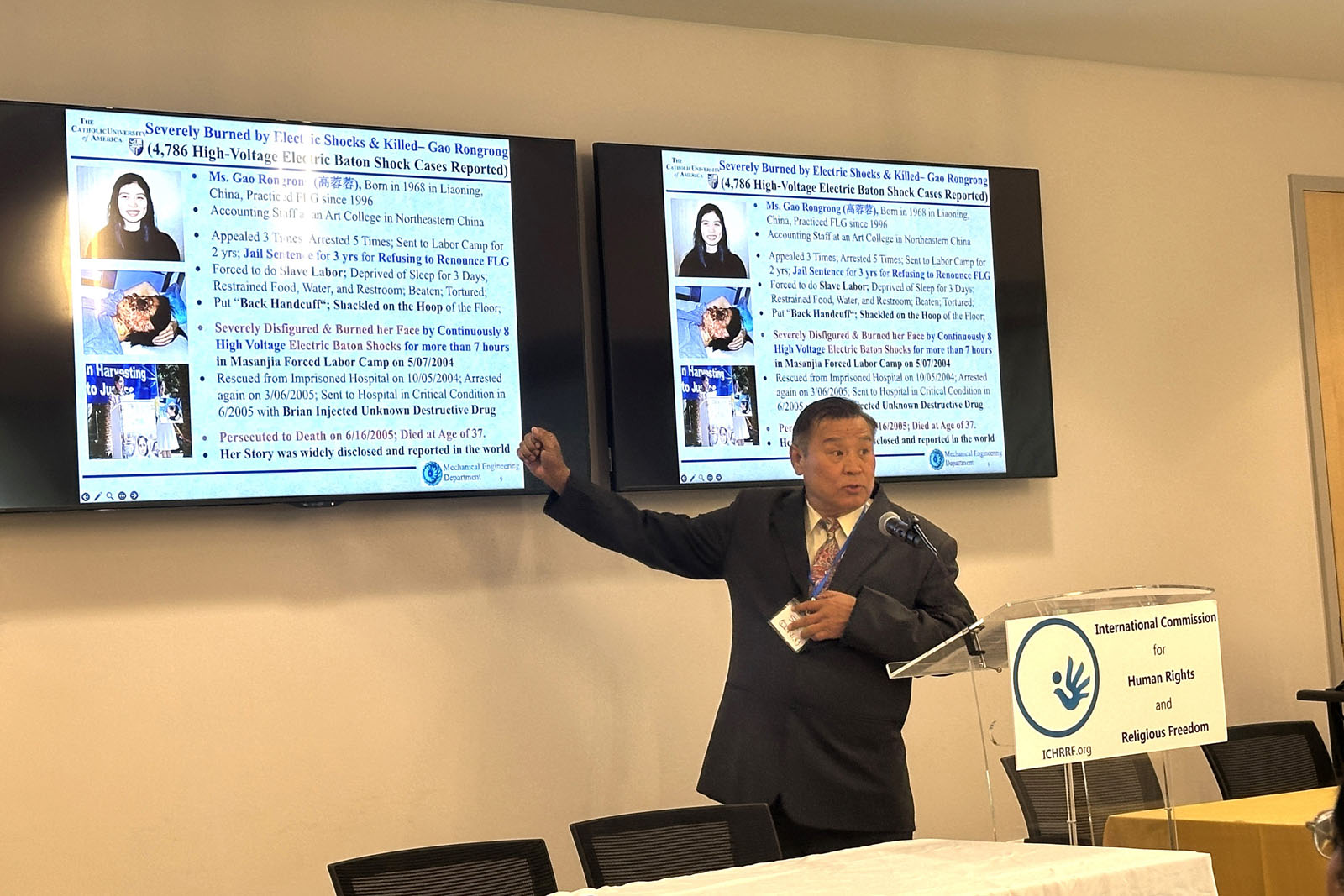 ![]() 图1:二零二五年十月十日和十一日,国际人权与宗教自由委员会在美国弗吉尼亚州洛顿举办了为期两天的年会。美国天主教大学工程学荣誉退休教授聂森博士在会上讲述了在中国持续发生的中共对法轮功学员的迫害。 |