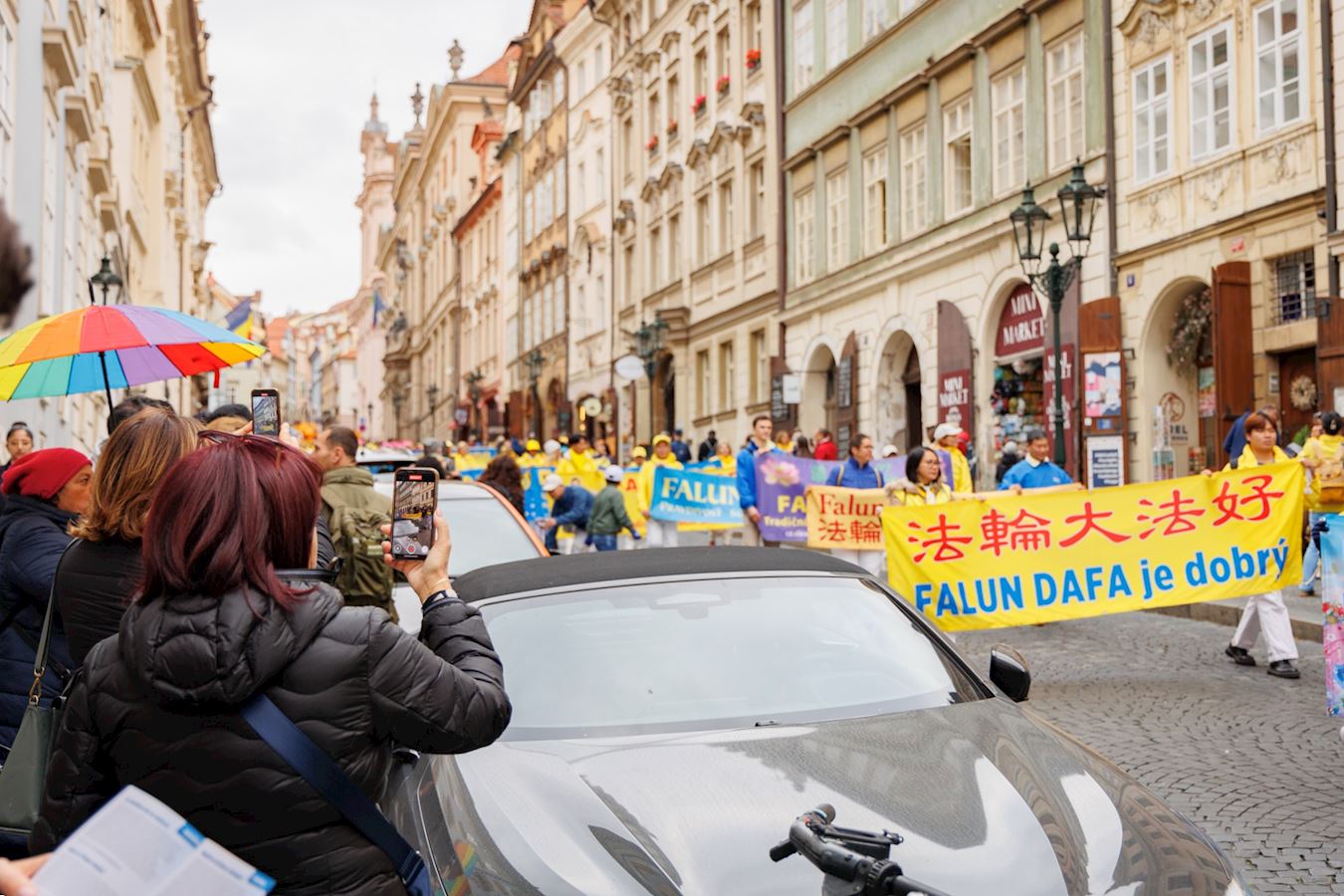 上午十一点,游行队伍从布拉格城堡山广场(Hradčanské Square)出发,行至终点旧城区广场(Old Town Square)。道两旁的游客和当地市民纷纷驻足欣赏节奏明快的音乐,观赏色彩缤纷的游行队伍。游行队伍中,除了演奏乐曲的天国乐团之外,还有舞龙、舞狮、手持莲花的仙女队、以及铿锵有力的腰鼓表演。很多观众拿出手机拍照和录像,并主动接受法轮功真相传单。
