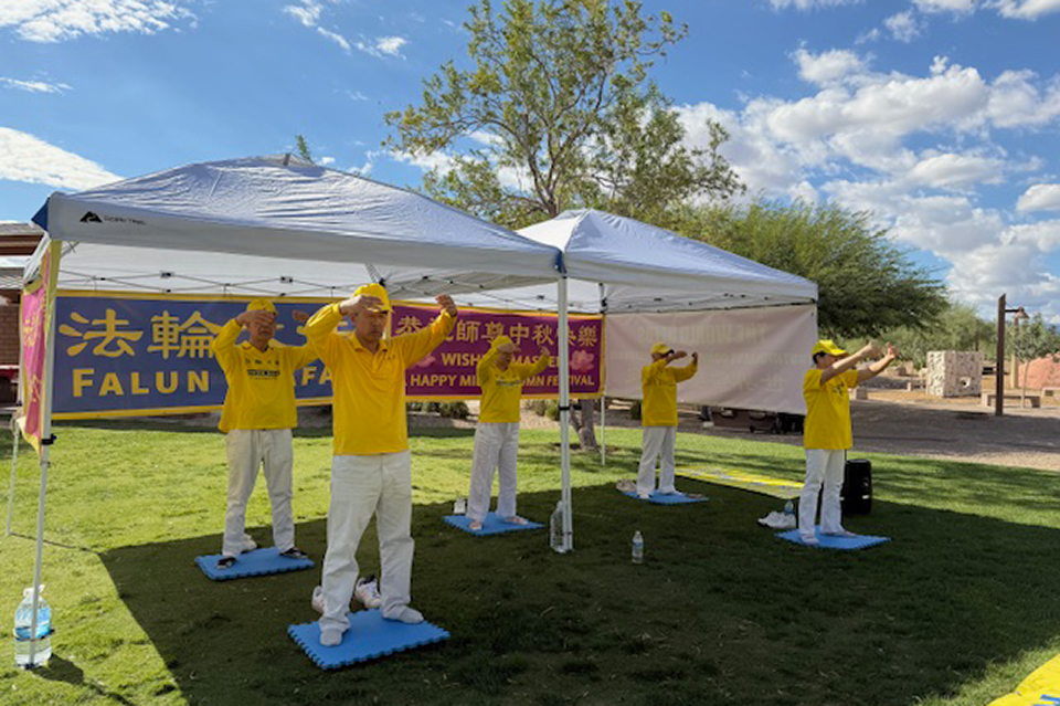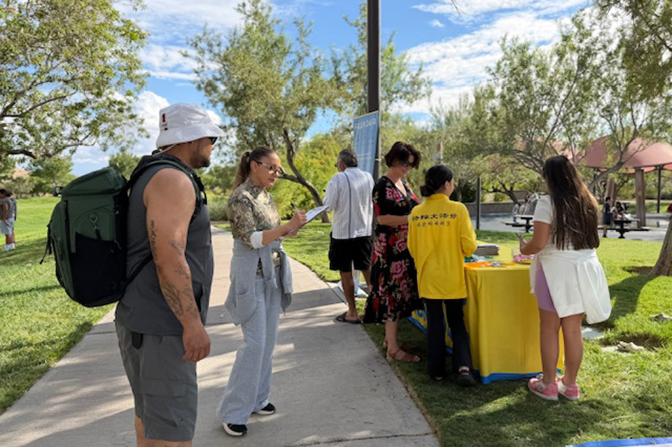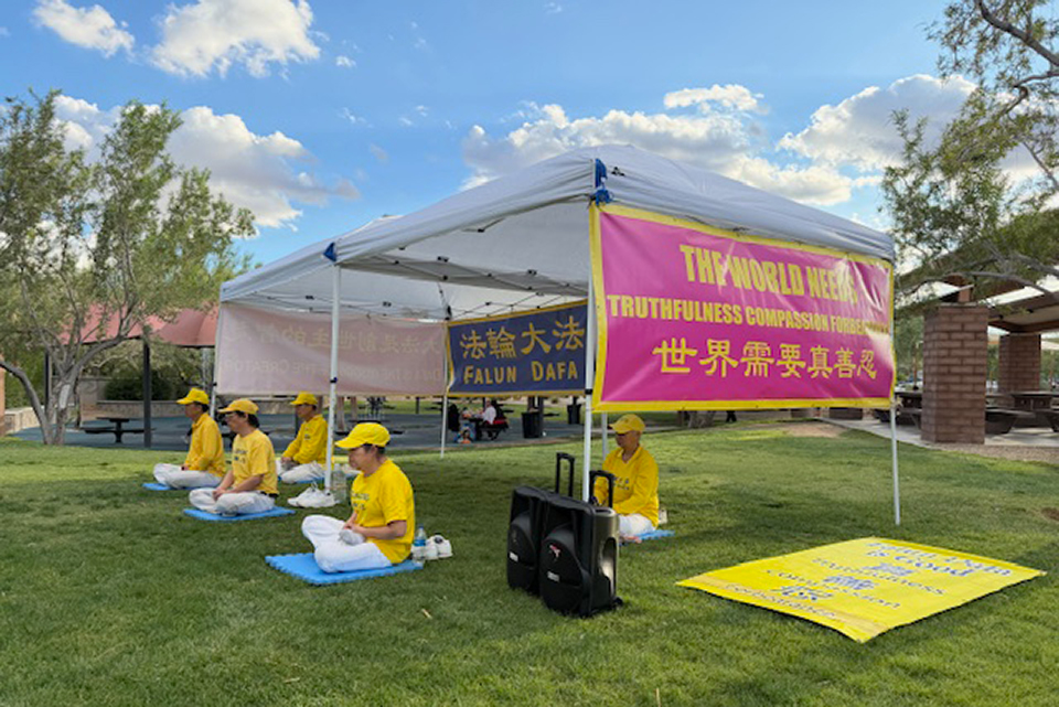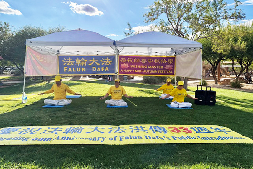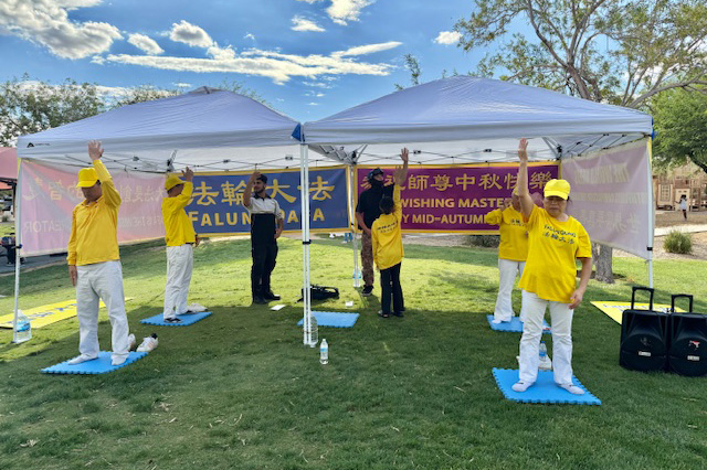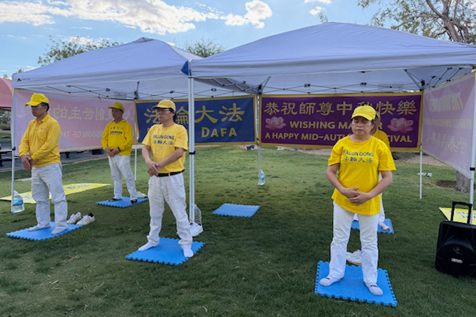 ![]() 图1~5:二零二五年九月二十八日下午,拉斯维加斯法轮功学员在探索峰公园举办庆祝活动,学员进行功法展示,把大法的美好传递给当地民众,同时恭祝师尊中秋快乐。 |