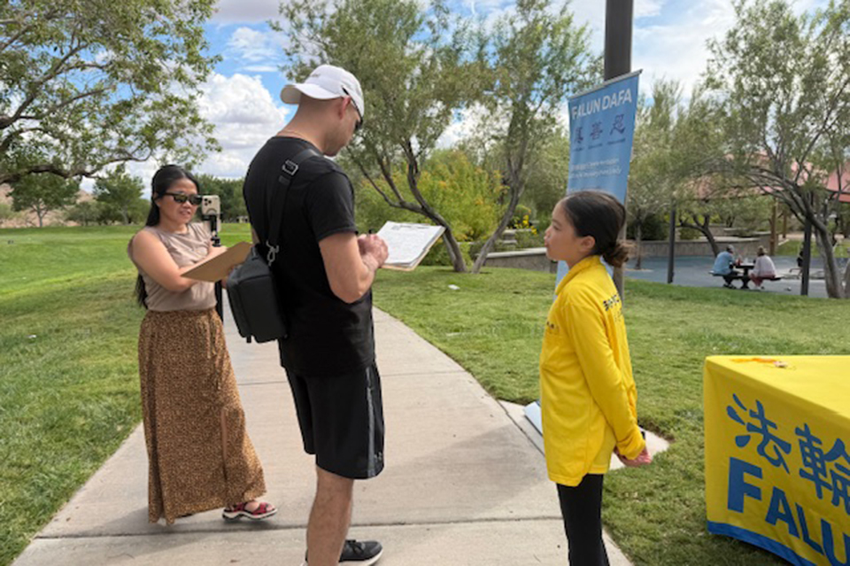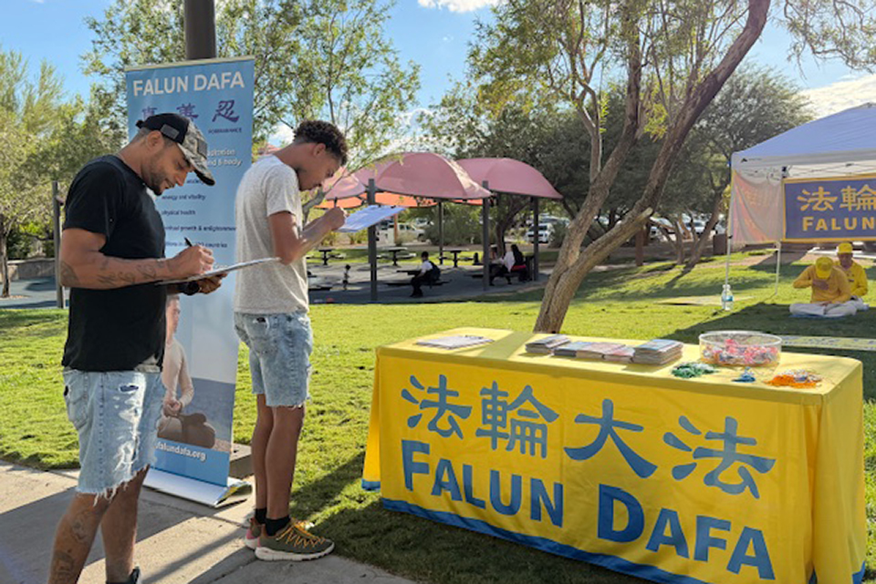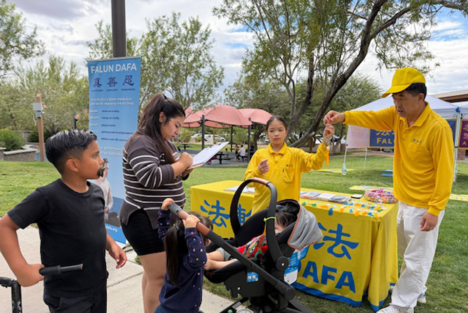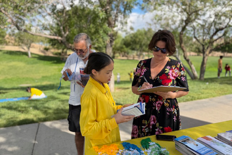 当天下午学员们进行了五套功法的演示、发放真相资料以及征集支持参议院推动《法轮功保护法案》的签名等活动。祥和温暖的炼功场面吸引很多人们的关注。很多民众积极参与征签,谴责中共对法轮功的迫害和跨国镇压。