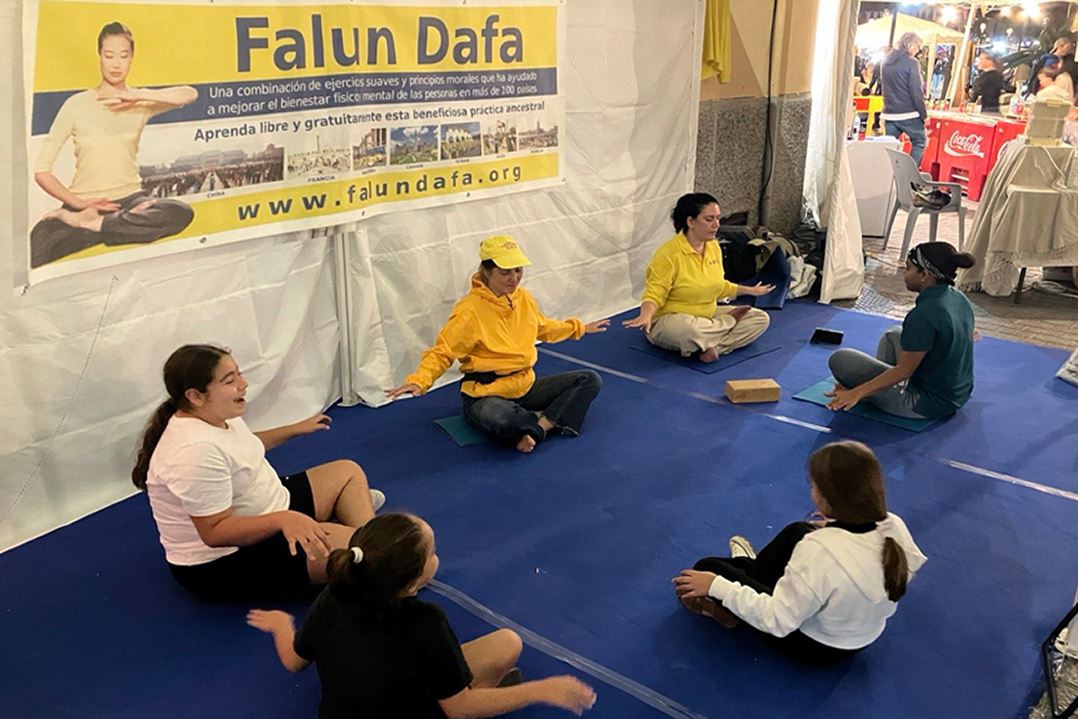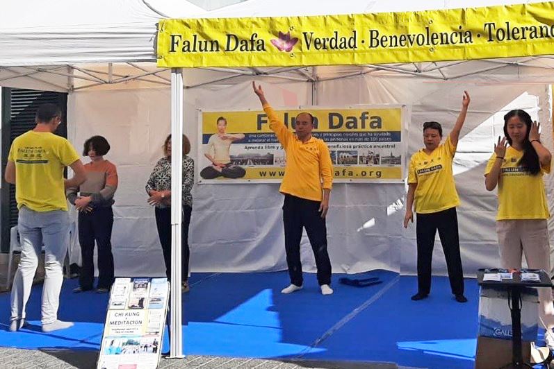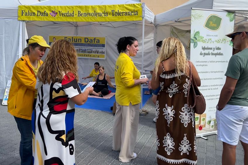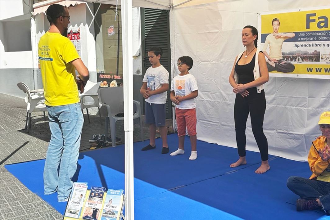 【明慧网二零二五年十月二十七日】二零二五年十月十八至十九日,西班牙马略卡岛的小镇印卡(Inca)的“大地”集市,法轮功学员设立展位,展示法轮功的功法,并传递法轮大法的美好和真相,吸引当地居民和游客驻足了解法轮功。许多人们来到展位学功,有的多次来炼功甚至不想离开。更有人请购了《转法轮》宝书,表示回去要找炼功点炼功。