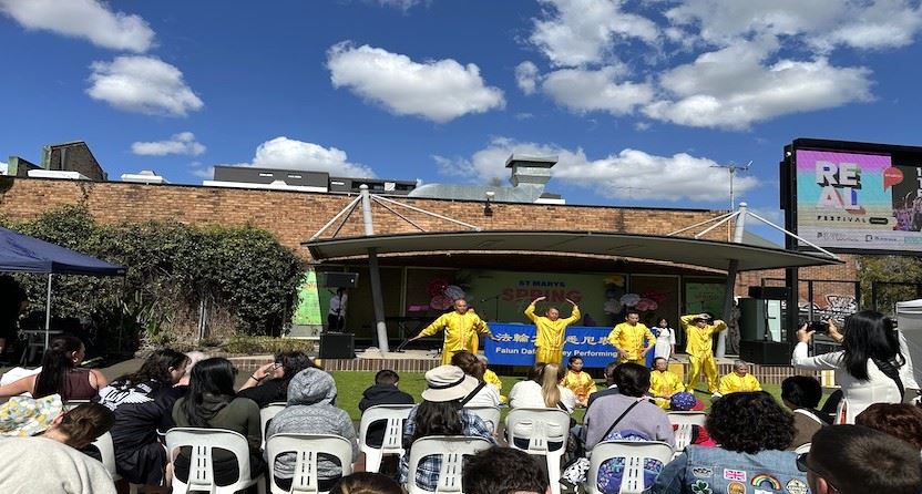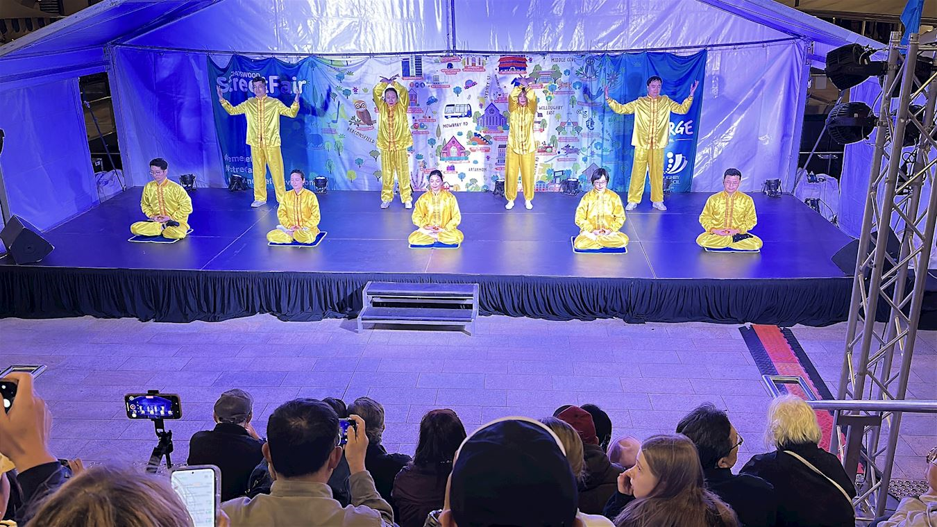 图14:十月十八日,法轮功学员在悉尼北部伊斯特伍德的舞台上演示五套功法。