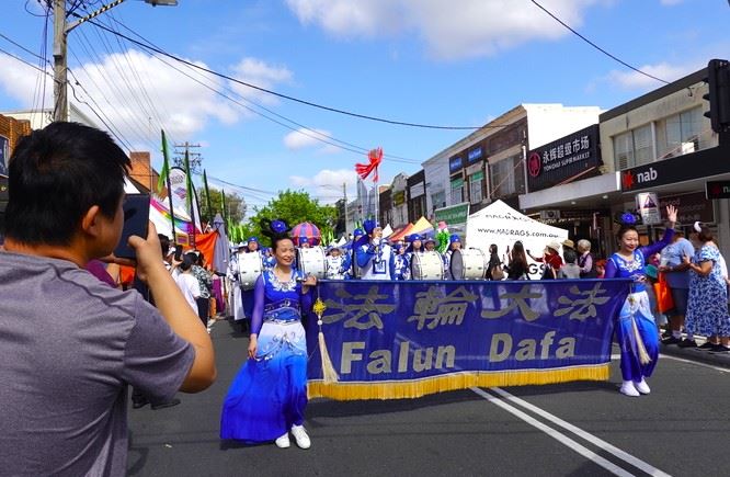 九月六日,由法轮功学员组成的天国乐团和腰鼓队参加了悉尼查茨伍德(Chatswood)举行的迎春庆典游行活动。