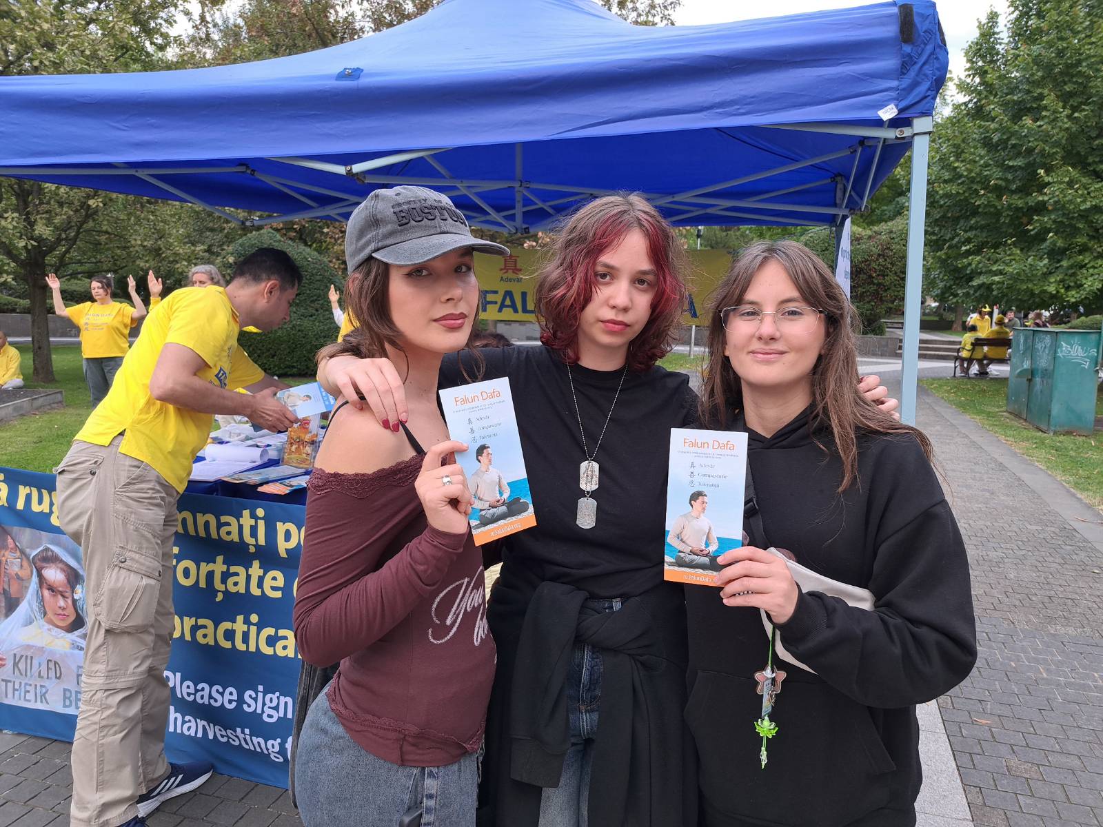 十二年级的学生弗洛丽娜(Florina ,左)、尤利娅(Iulia)和阿内莉丝(Anelise)阅读了传单并在请愿书上签名。学员向她们详细介绍中共活摘器官的残酷迫害。当了解到法轮功学员如何遭受迫害、殴打和酷刑,以及他们如何被活摘器官,弗洛丽娜流下了眼泪。