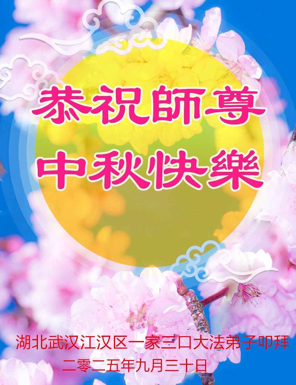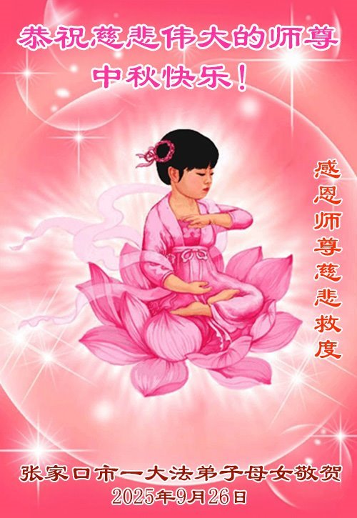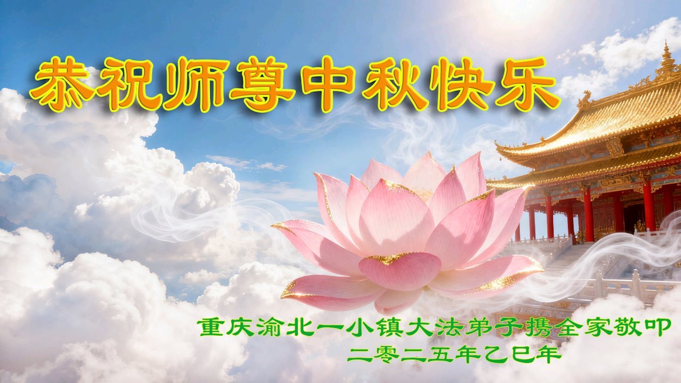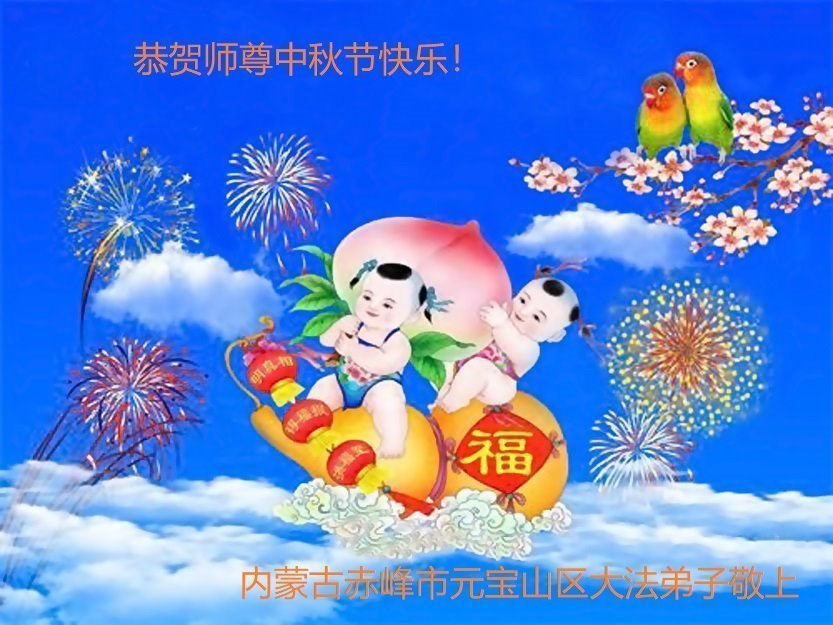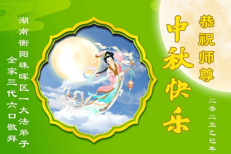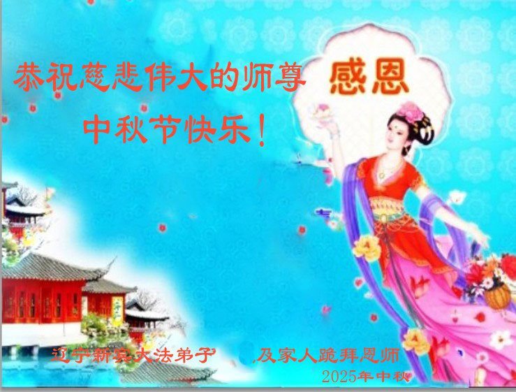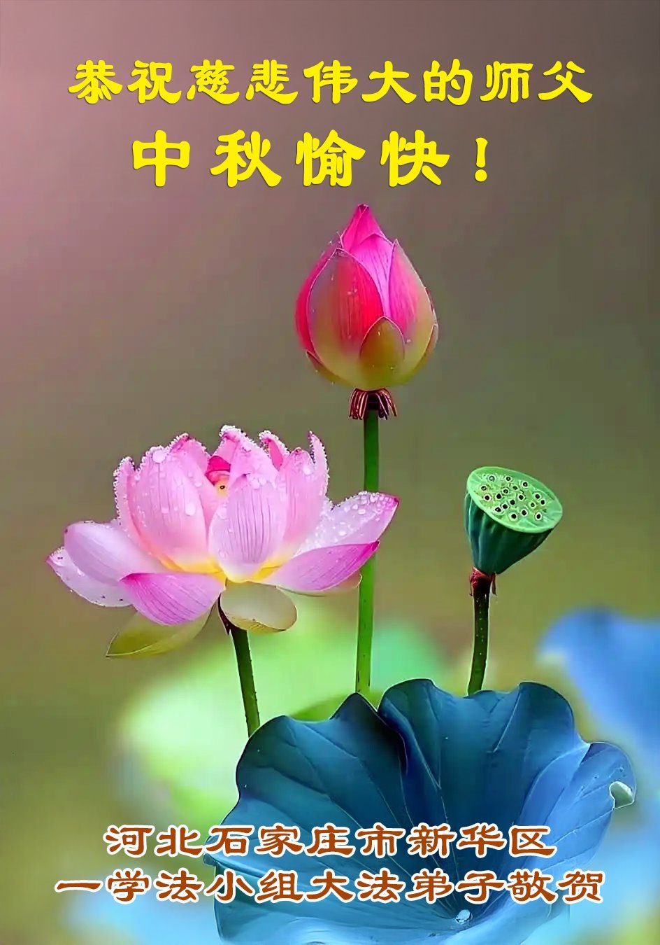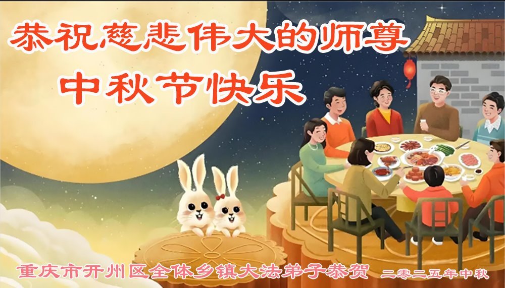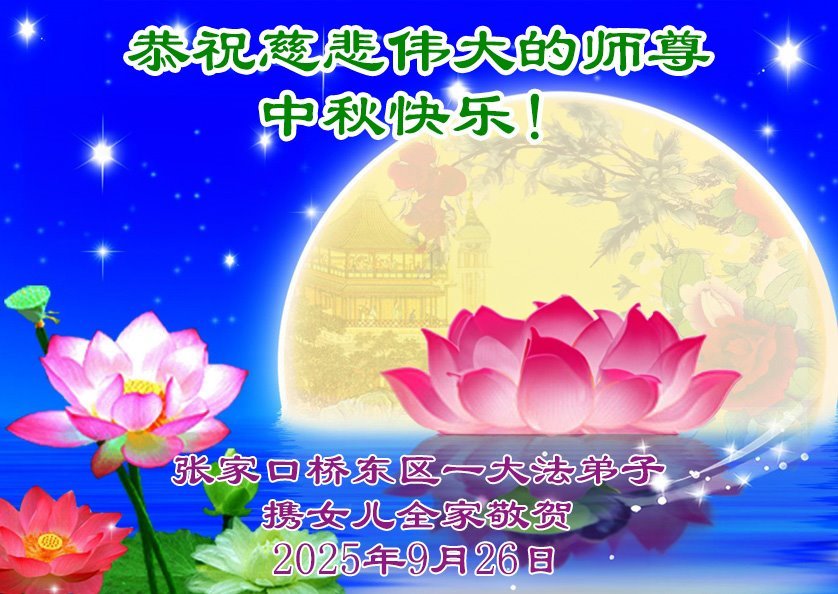 我们大法弟子携家人和明真相的世人恭祝师尊中秋节快乐!师尊辛苦了!谢谢师尊的慈悲苦度!弟子一定破除旧势力的安排,消除间隔,形成强大的整体,反迫害,救度众生。弟子们要多学法,学好法,发好正念,向内找,兑现自己的誓约,跟师父回家。