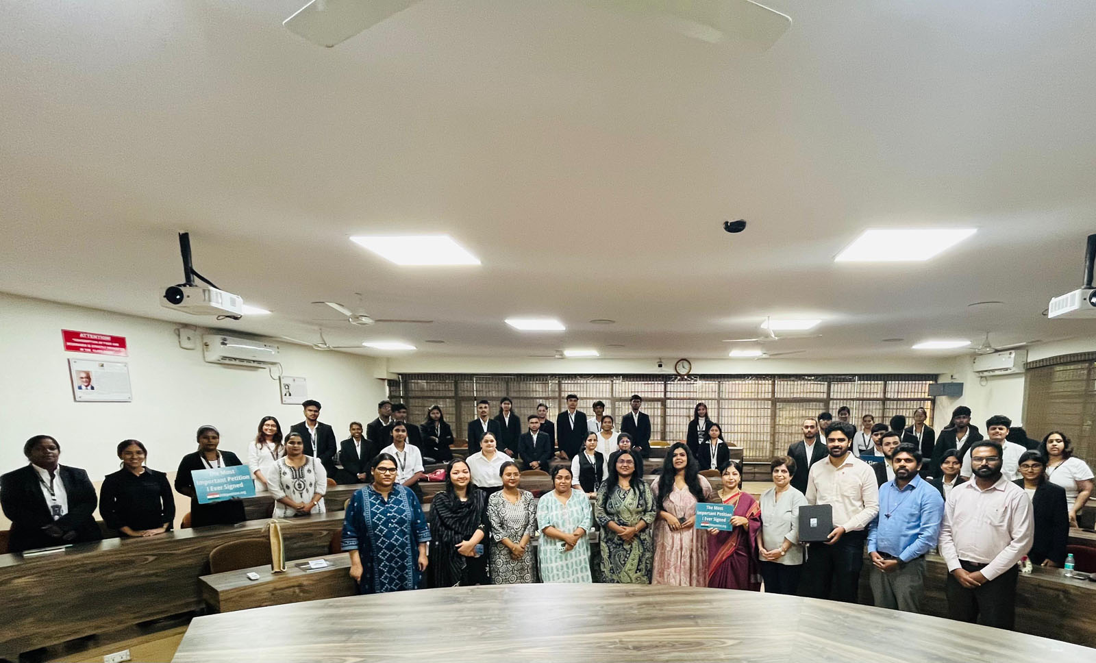 图1:前排从右至左依次为:DAFOH成员吉里达尔博士(Dr. Giridhar)、何塞·约翰尼(Jose Johny)和维平·穆德高德,法轮功学员奇特拉·德夫纳尼(Chitra Devnani),以及 IFIM 法学院副校长沙古芙塔·安朱姆博士(右起第五位)和她的教师团队