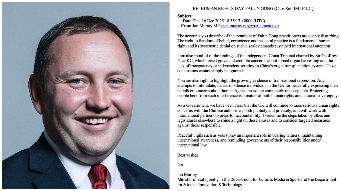 【明慧网二零二五年十二月十八日】(明慧网英国记者报道)二零二五年十二月十日国际人权日当晚,英国法轮大法学员在伦敦中共大使馆对面举行了烛光守夜和和平反迫害活动。英国政府文化、媒体与体育部及科学、创新与技术部联合任命的国务大臣伊恩·默里(Ian Murray)致函表示,肯定法轮功学员的活动在见证事实、保持国际社会关注,以及提醒各国政府履行其国际法义务方面所发挥的重要作用。