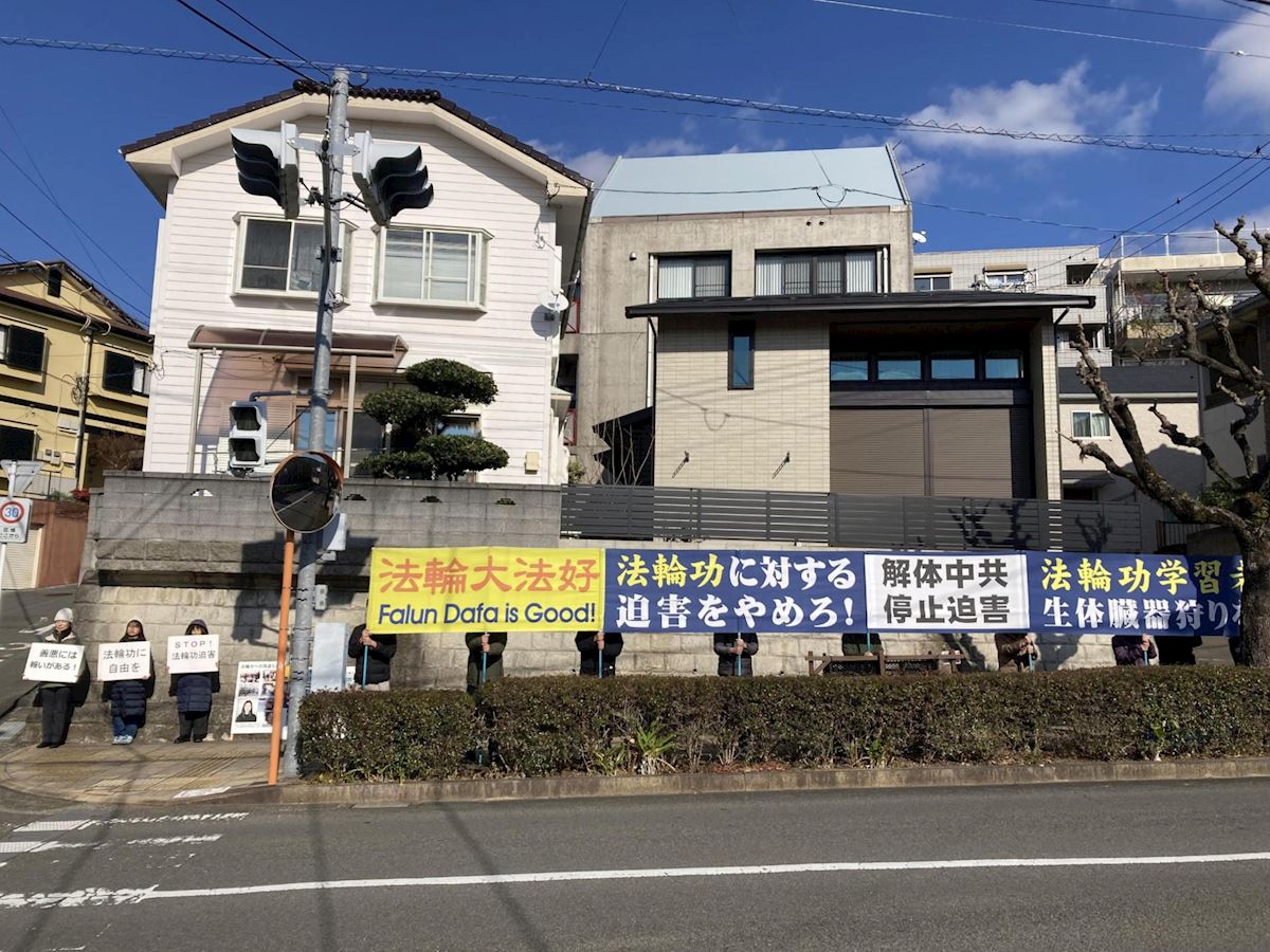 学员们整齐地展示多条中日文横幅与真相展板,上面写有“法轮大法好”“立即停止对法轮功的迫害”“立即停止对法轮功学员的活摘器官”“还法轮功自由”“STOP!对法轮功的迫害”“善恶必报”“STOP!活摘器官”等醒目标语,强烈谴责中共对法轮功迫害。