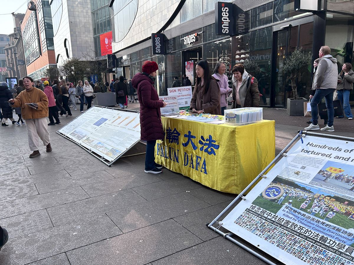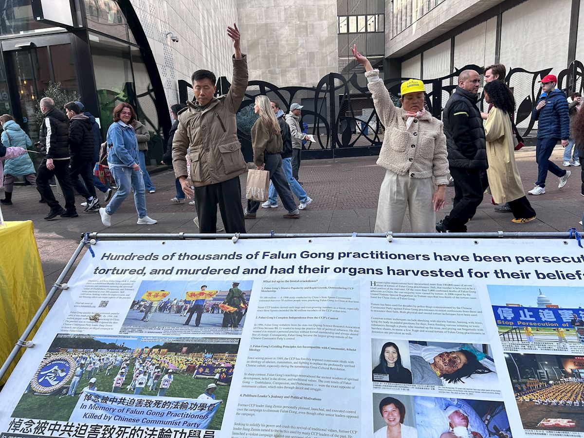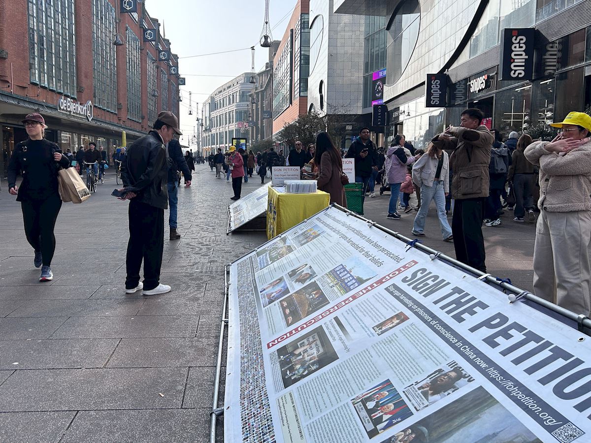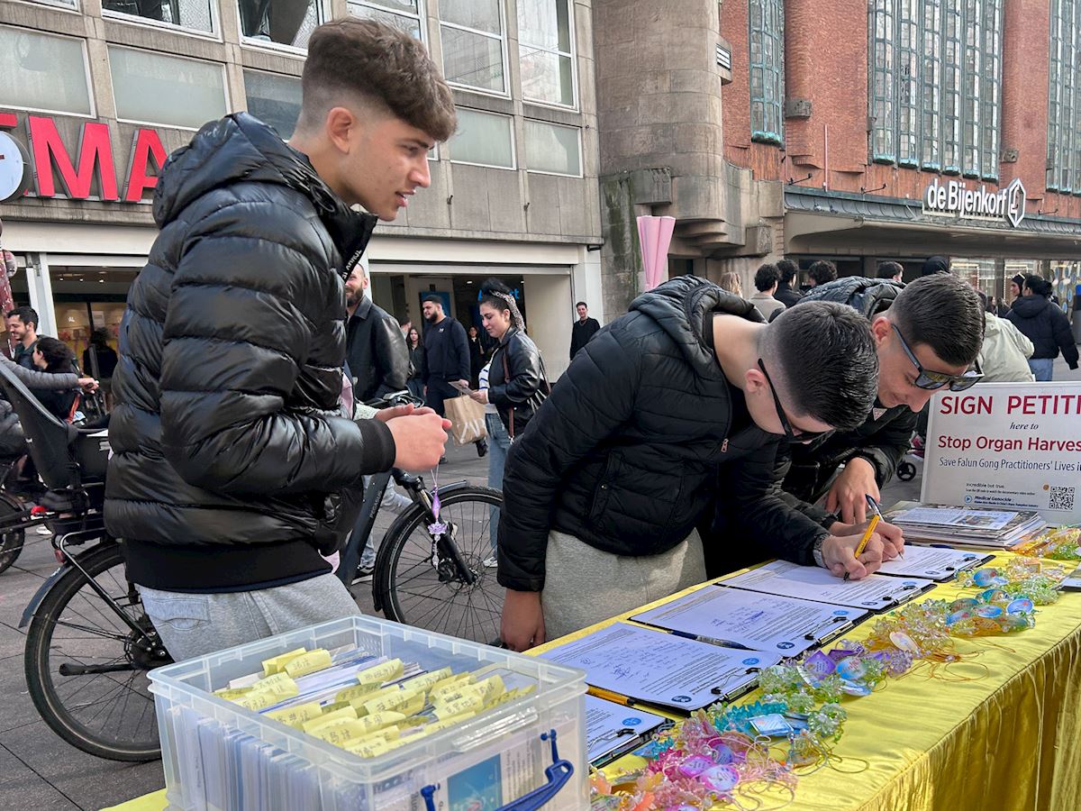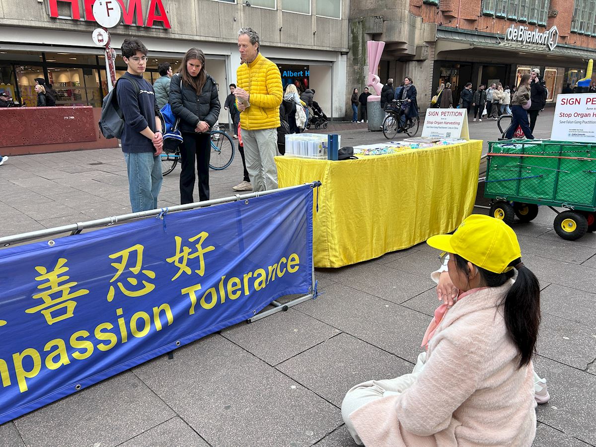 一位海牙市民静静的看着展板上关于法轮功五套功法的介绍,又专注地看法轮功学员的功法展示后,上前询问。他表示,“法轮功学员们很平静,与街上喧嚣的人流形成了鲜明的对比。”当得知这样一个平和的修炼团体已经在中国大陆被镇压近二十七年,他立即签名支持学员们反迫害。离开真相点没多久,他又走回来静静的阅读法轮功学员在中国遭受迫害的展板,学员向他介绍海牙义务教功的地点,他很有兴趣,表示要去尝试一下。