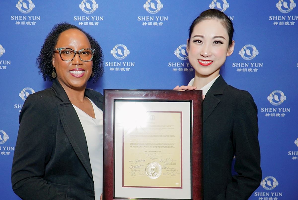 ![]() 图7:二零二六年三月十日晚,哥伦比亚市议会幕僚长查妮可・贝尔顿(Chanique Belton,左)在演出现场向神韵艺术团颁发褒奖状。(新唐人) |