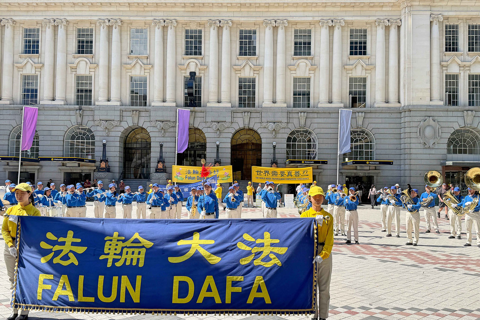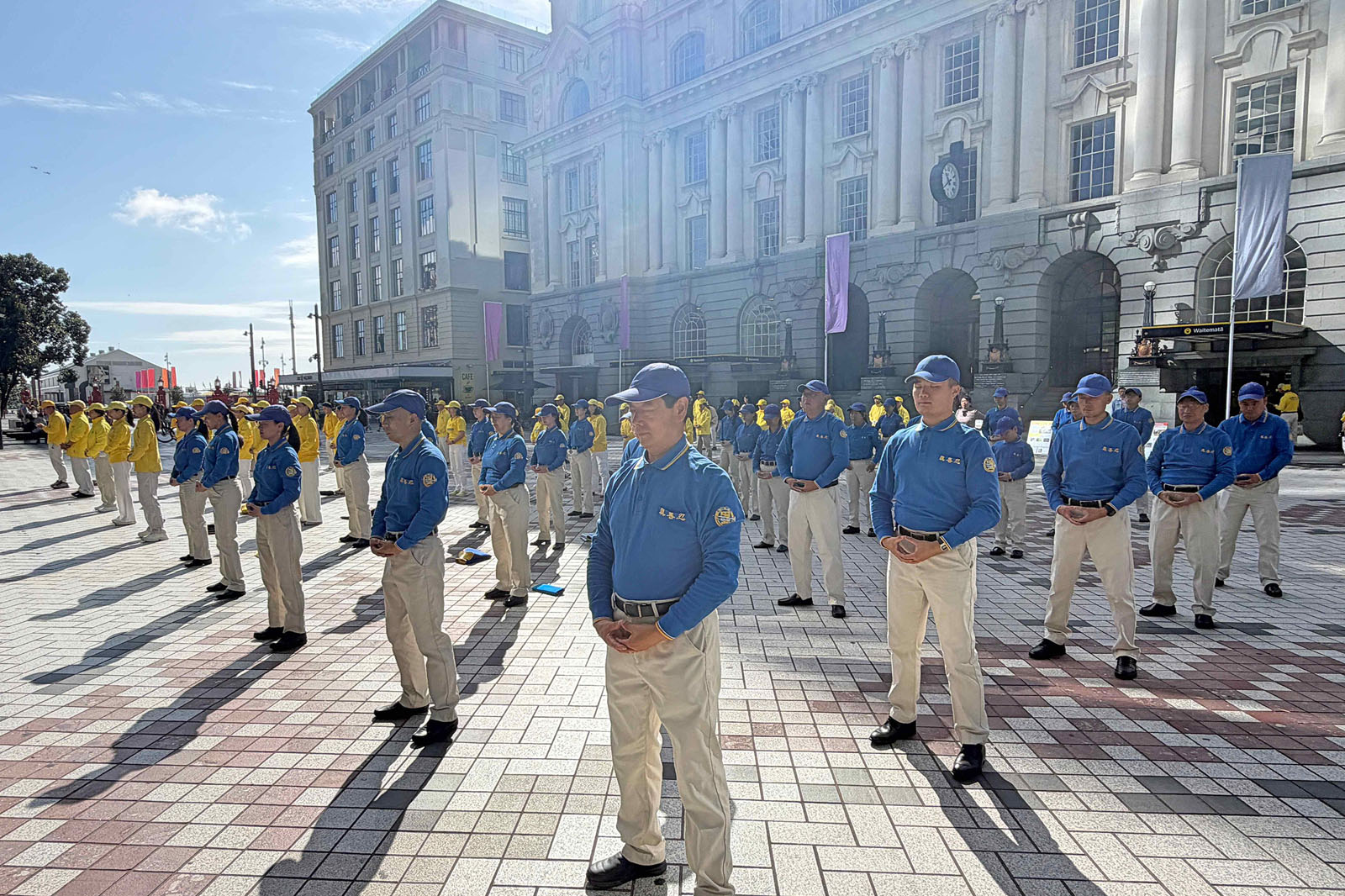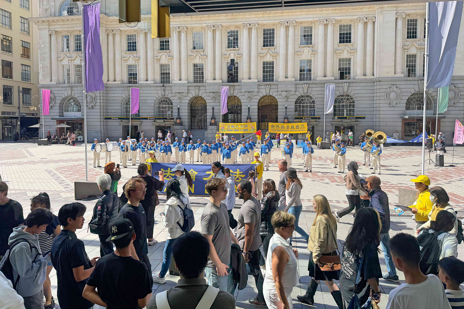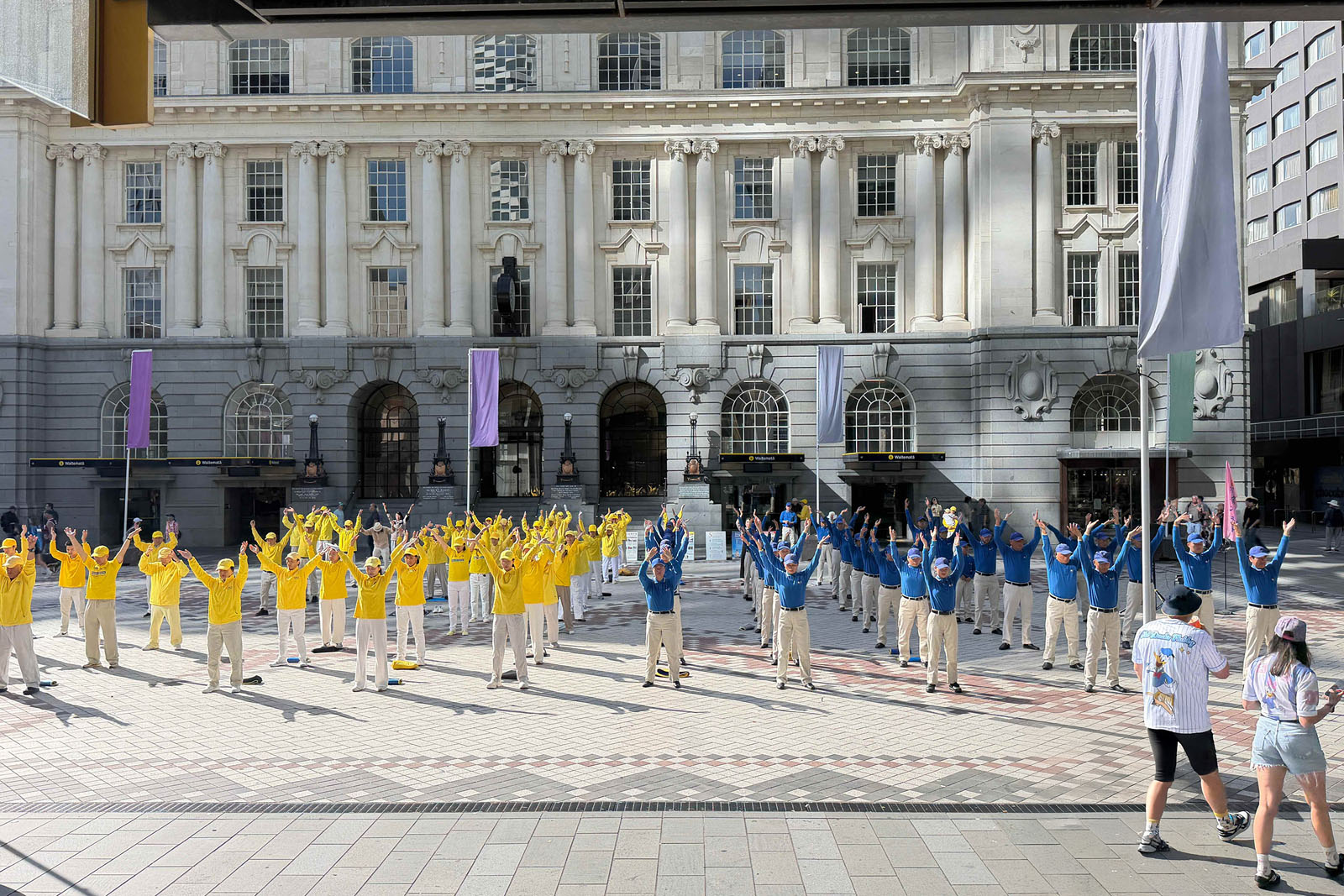 当天,天国乐团以整齐的队形和响亮的铜管乐声在广场演出,旋律庄重、富有感染力,吸引了不少民众驻足聆听。接下来,法轮功学员在舒缓音乐中演示五套功法,动作舒展自然,场面祥和。