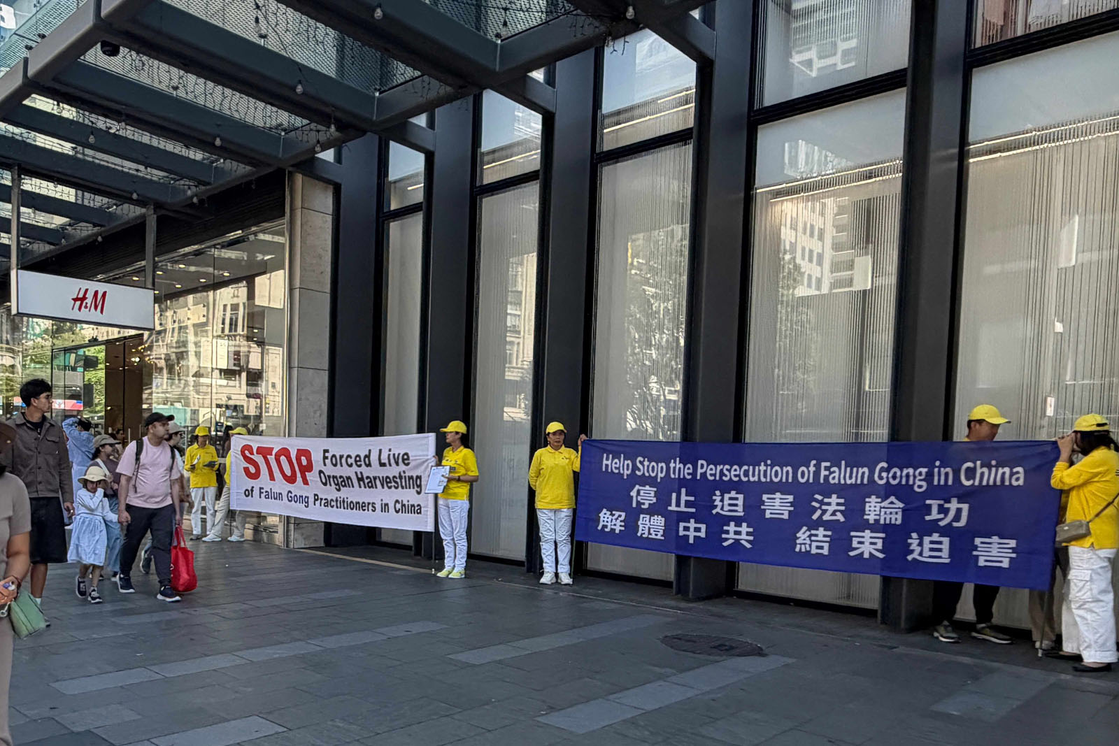 图4:法轮功学员在奥克兰市中心展示真相横幅。