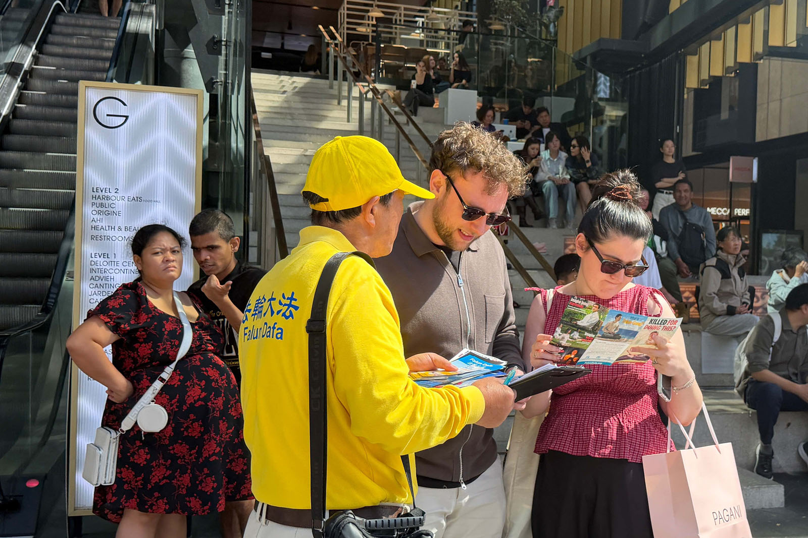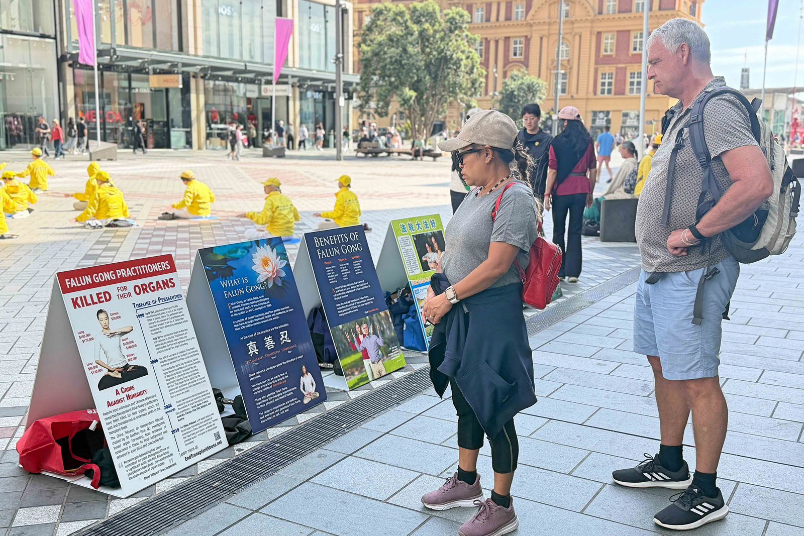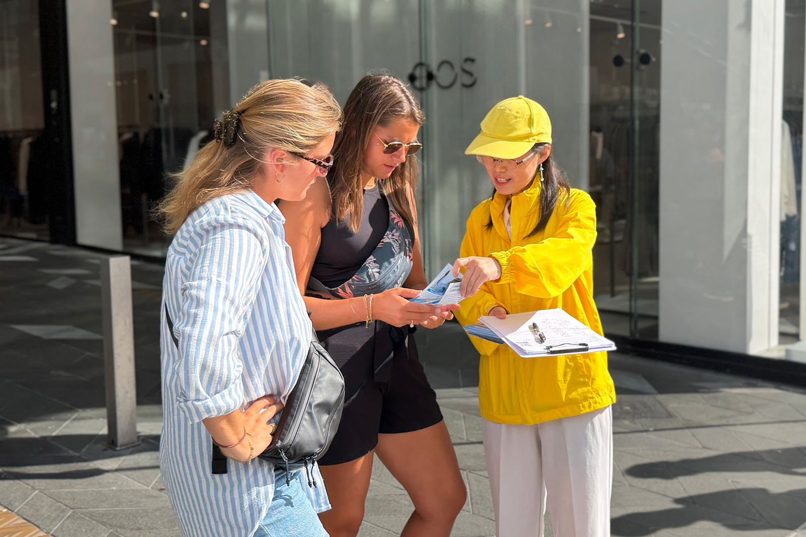 往来游客及市区购物者或驻足观看、拍照,或阅读展板、与学员交谈了解法轮功的修炼方式及其带来的身心变化。学员们还向公众讲述在中国发生的迫害情况,使不少人对相关议题产生进一步关注。