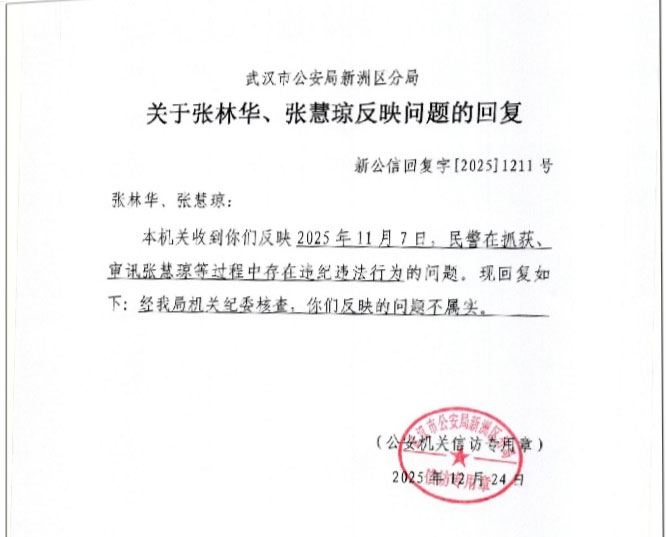 2025年11月21日张慧琼从武汉第一看守所释放回家后,开始和张林华一起控告新州分局相关办案人员。他们依法向武汉市新洲区人民检察院、最高人民法院