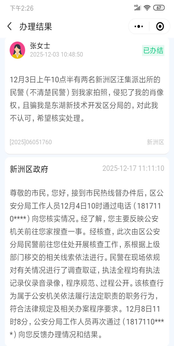 张慧琼依法向湖北信访、武汉市民热线、武汉市公安局举报新州分局办案人员的种种违法犯罪行为,却答复:有开执法记录仪录音录像,程序得当,过程公开,符合相关办案程序要求。