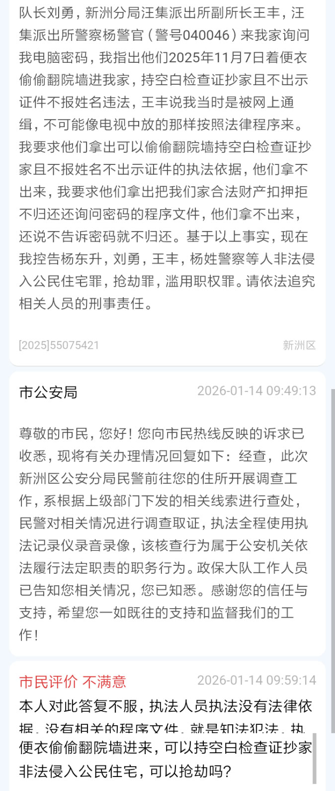 五、入室抢劫后,警察违法上门要密码,投诉举报却答复程序得当、过程公开