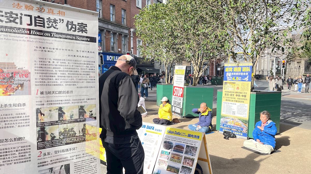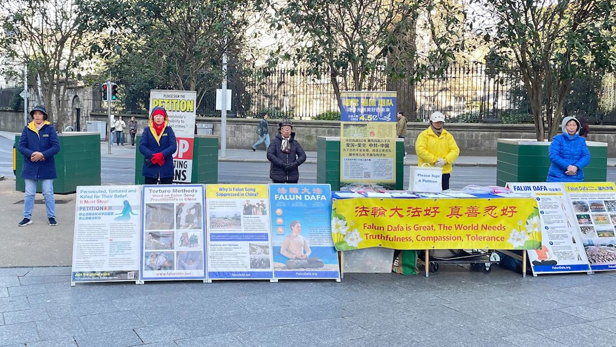 二零二六年三月的每个周末,法轮功学员在都柏林举办讲真相活动,传递真、善、忍的美好并揭露中共的残酷迫害。随着中国留学生和移民的增加,以及疫情后大陆游客的恢复,周一到周五,学员也会在此设立信息点,便于更多同胞获得未经过滤的真实信息。许多中国人在这里做了三退,也有明真相的中国人经过时,高喊“法轮大法好”表达支持。
