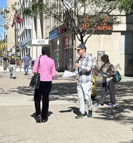 一名在多伦多金融行业工作的专业人士。一天经过时看到学员正在向路人发放法轮功真相资料。他接过材料后停下脚步,认真阅读了一会儿与学员进行了简短的交流。临走时,他留下了自己的联系方式,希望以后可以继续了解更多情况。