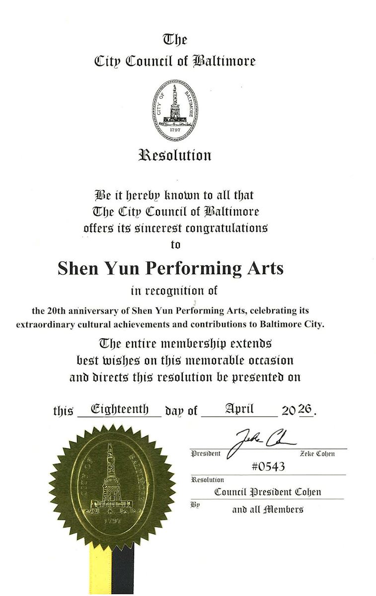 在今年神韵演出前夕,巴尔的摩市议会的十五位议员通过一项决议案,表彰神韵艺术团在文化领域取得的非凡成就。