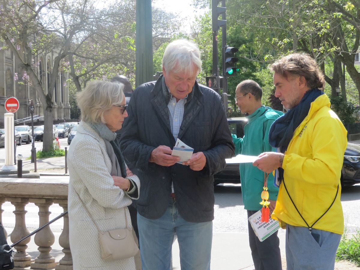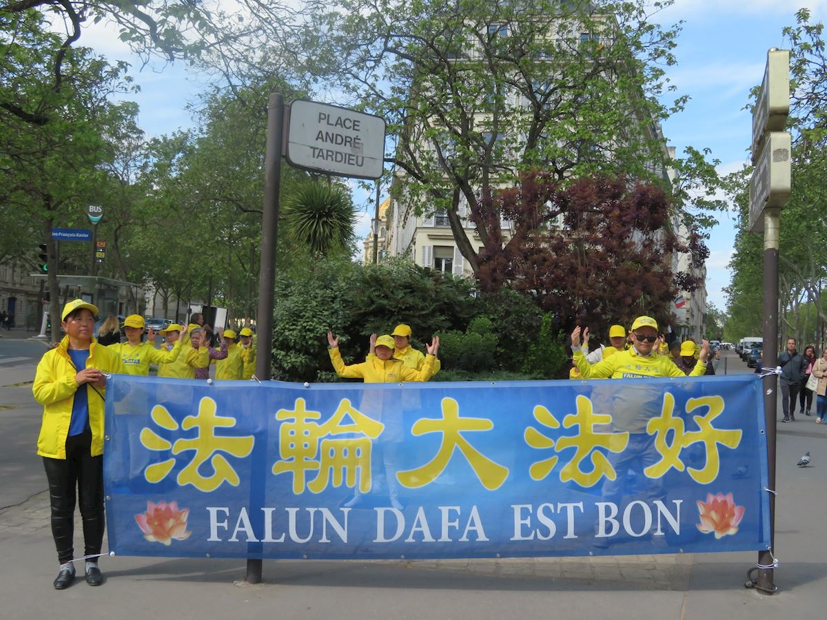【明慧网二零二六年四月二十三日】(明慧记者周文英巴黎采访报道)为纪念中国大陆法轮功学员“四·二五”和平上访二十七周年,二零二六年四月二十日下午,法国巴黎部分法轮功学员聚集在巴黎第七区的安德烈塔迪厄广场(Place André Tardieu),向巴黎民众和游客介绍法轮功以及法轮功学员和平理性反迫害的历程,揭露二十七年来中共对法轮功学员的迫害,甚至活摘器官。