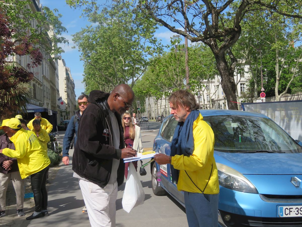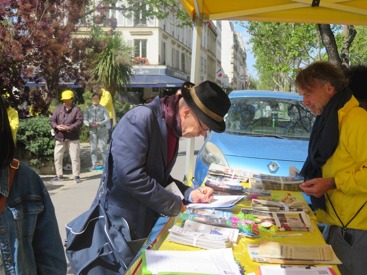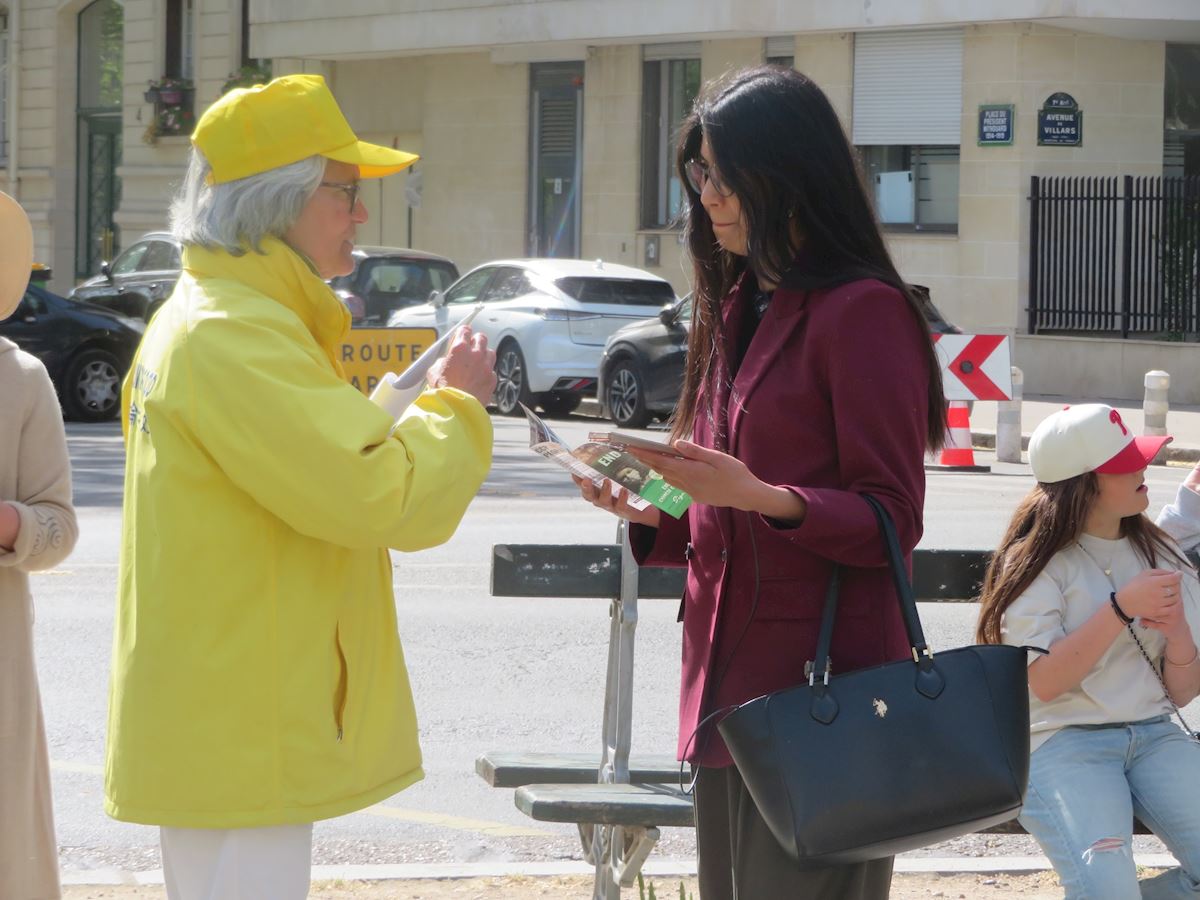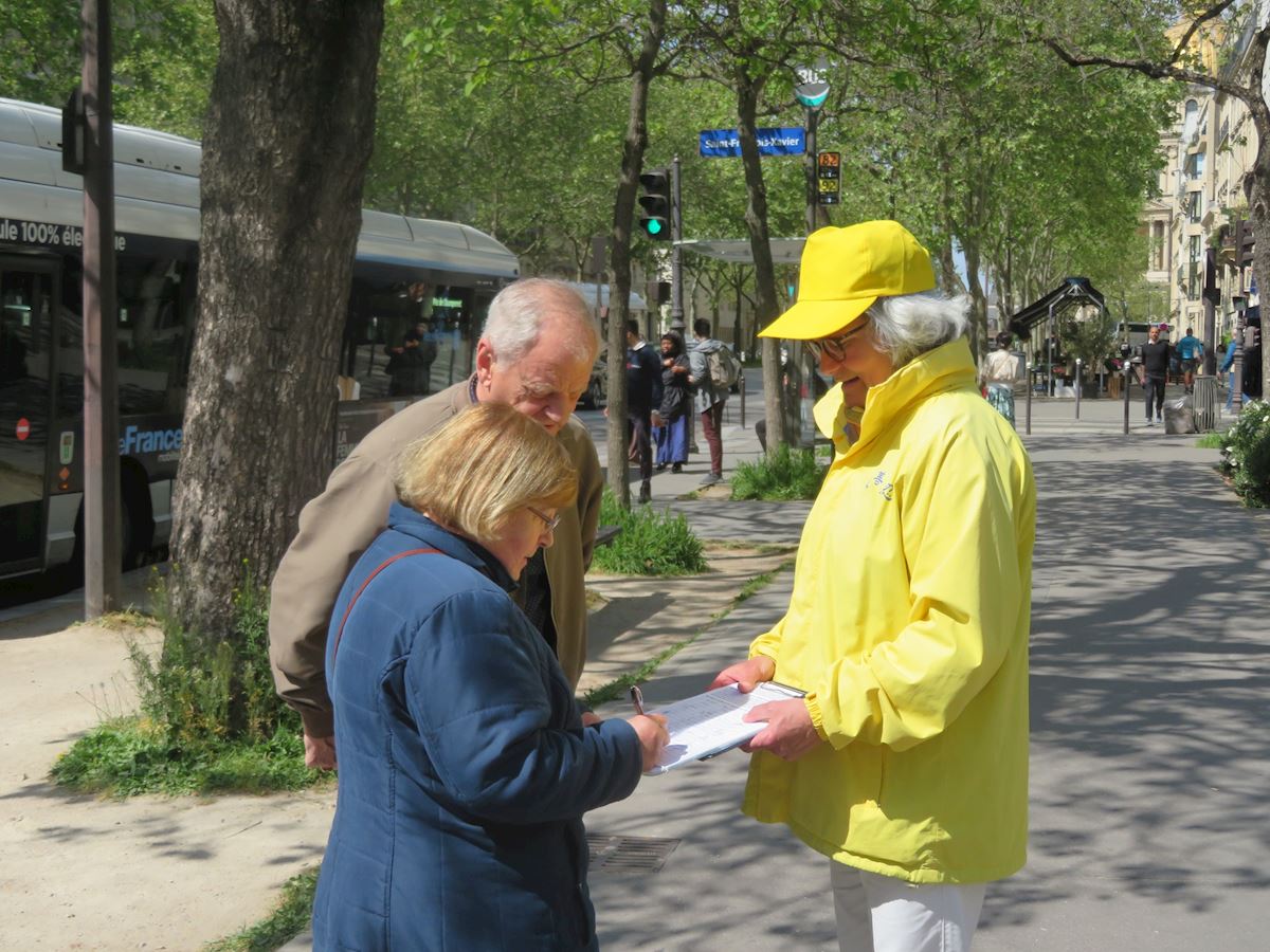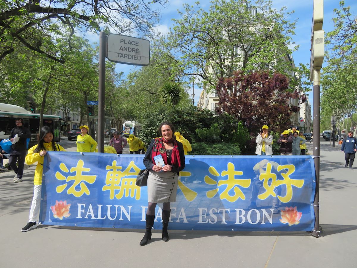 玛蒂尔德·多迪(Mathilde Dodie)是一所中学和索邦大学(La Sorbonne)的英语教师。她从地铁站出来,见到法轮功学员,感到非常亲切。九十年代,她曾在中国生活了九个月,看到很多人都练气功、太极等。她与法轮功学员交谈了很久,签署了反对中共强行摘取器官以及禁止修炼法轮功的请愿书。