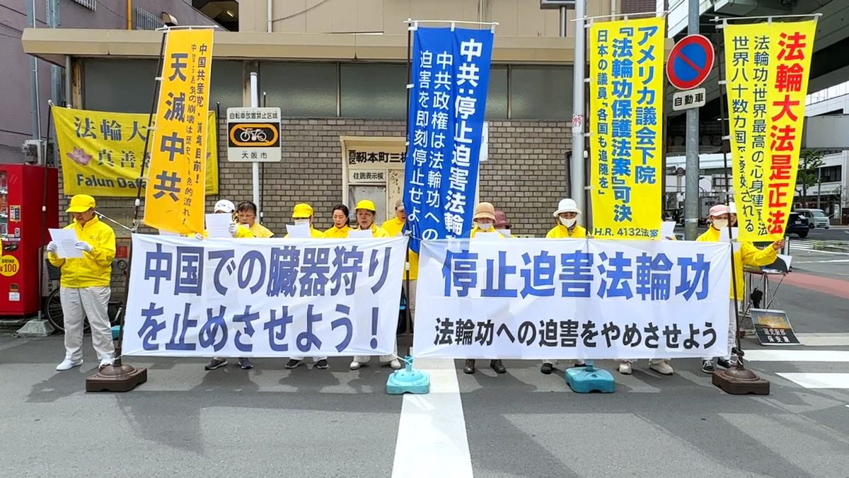 四月二十一日,部分关西地区法轮功学员来到大阪中领馆前,象往常一样打出横幅和平请愿,呼吁中共立即停止迫害法轮功。