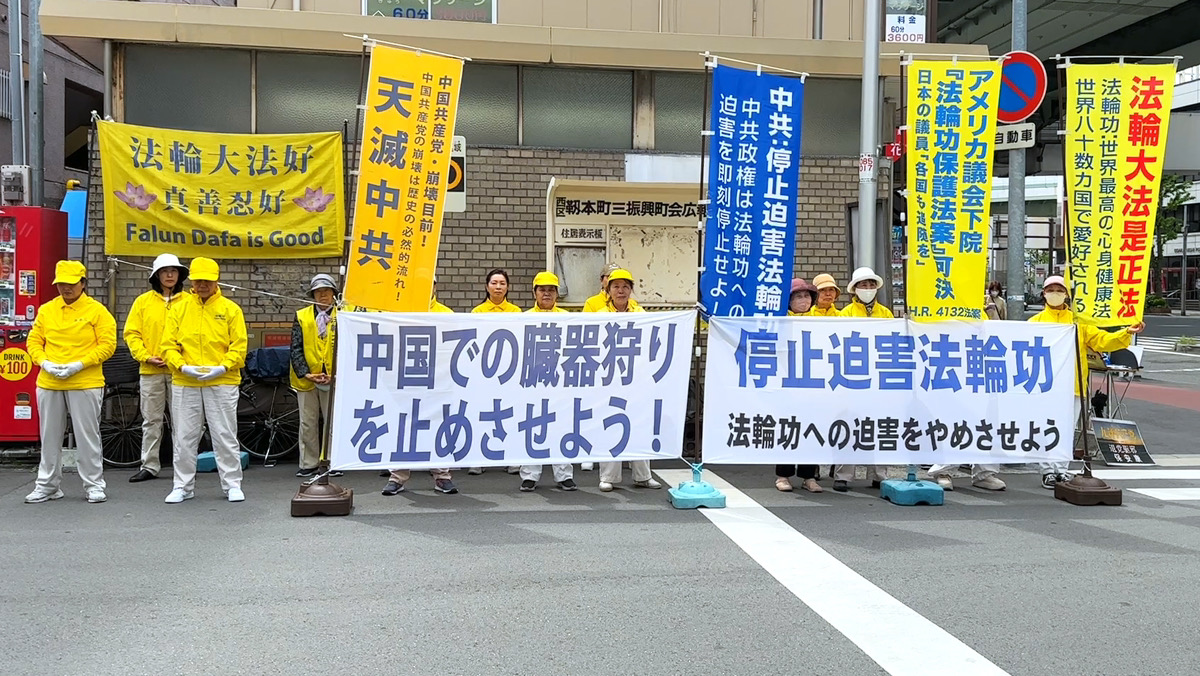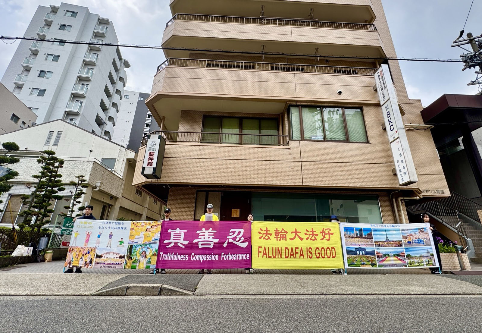 四月二十四日,部分福冈地区法轮功学员来到中共驻福冈中领馆前纪念四·二五和平请愿,同时呼吁中共立即停止迫害。