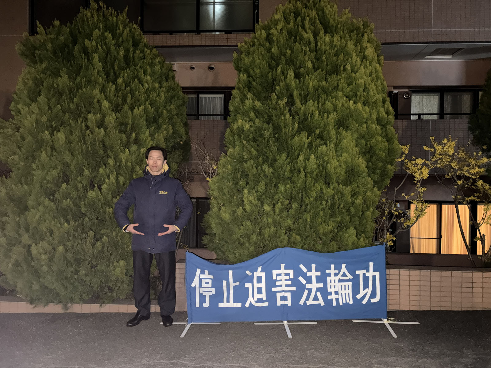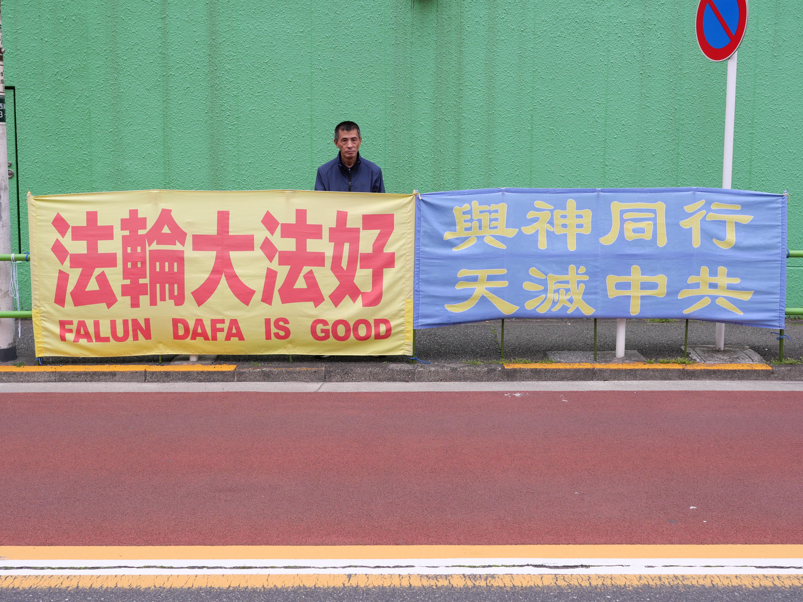 四月二十五日中午,法轮功学员孙先生来到位于东京的中国驻日本大使馆前打出横幅,呼吁中共停止迫害。