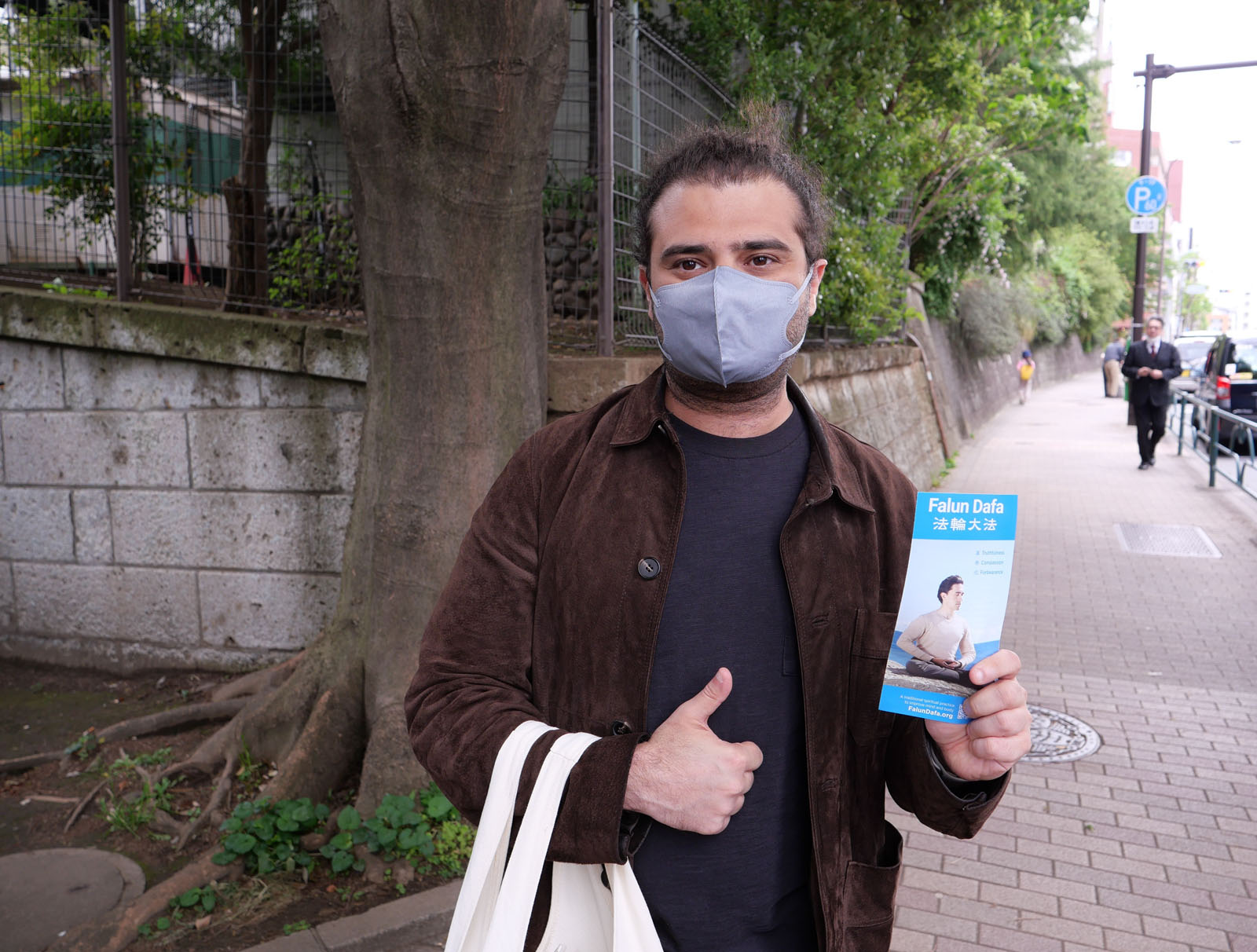当天路过东京大使馆的美国人Jake在听完法轮功遭受迫害的真相后说:“支持你们,加油!”