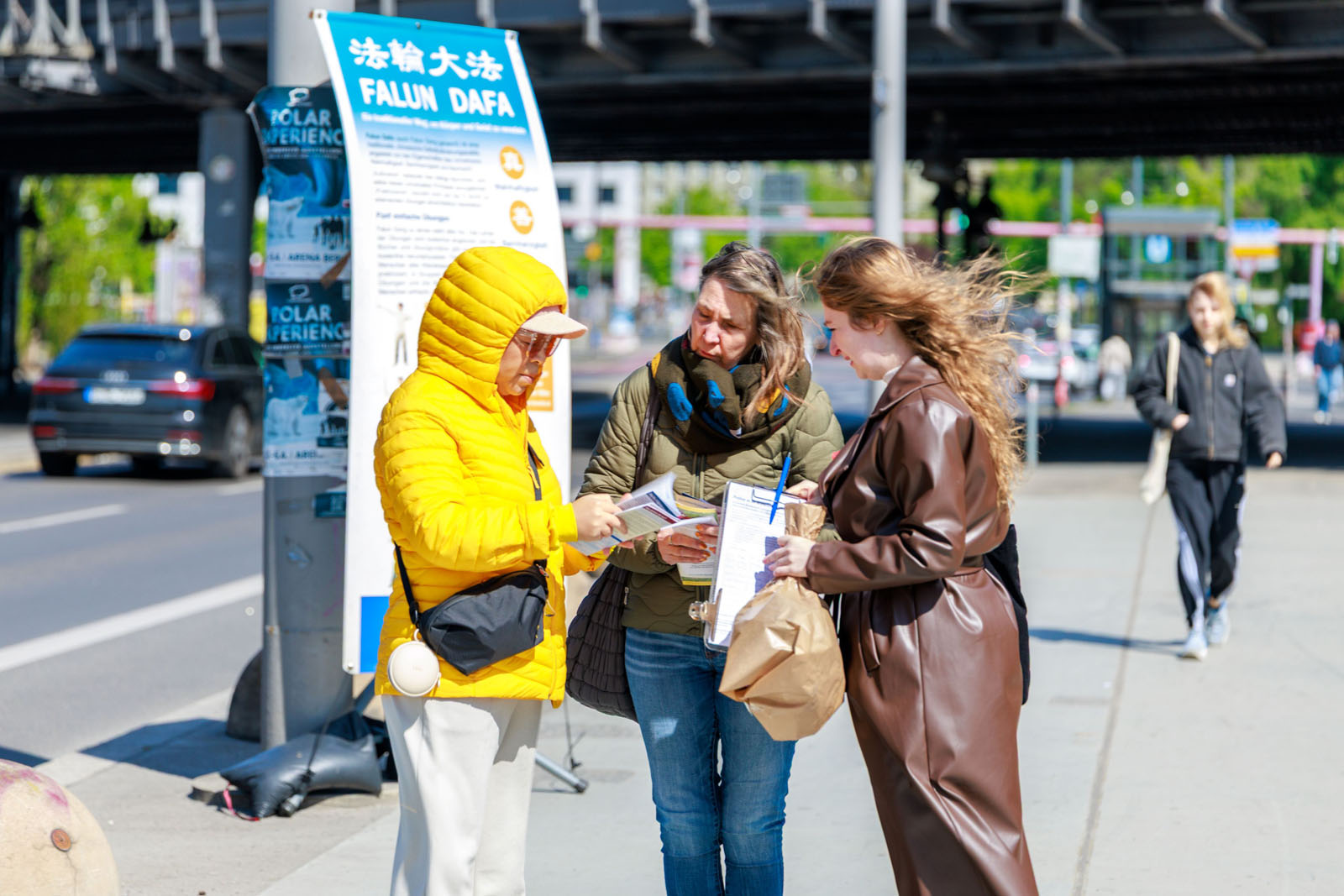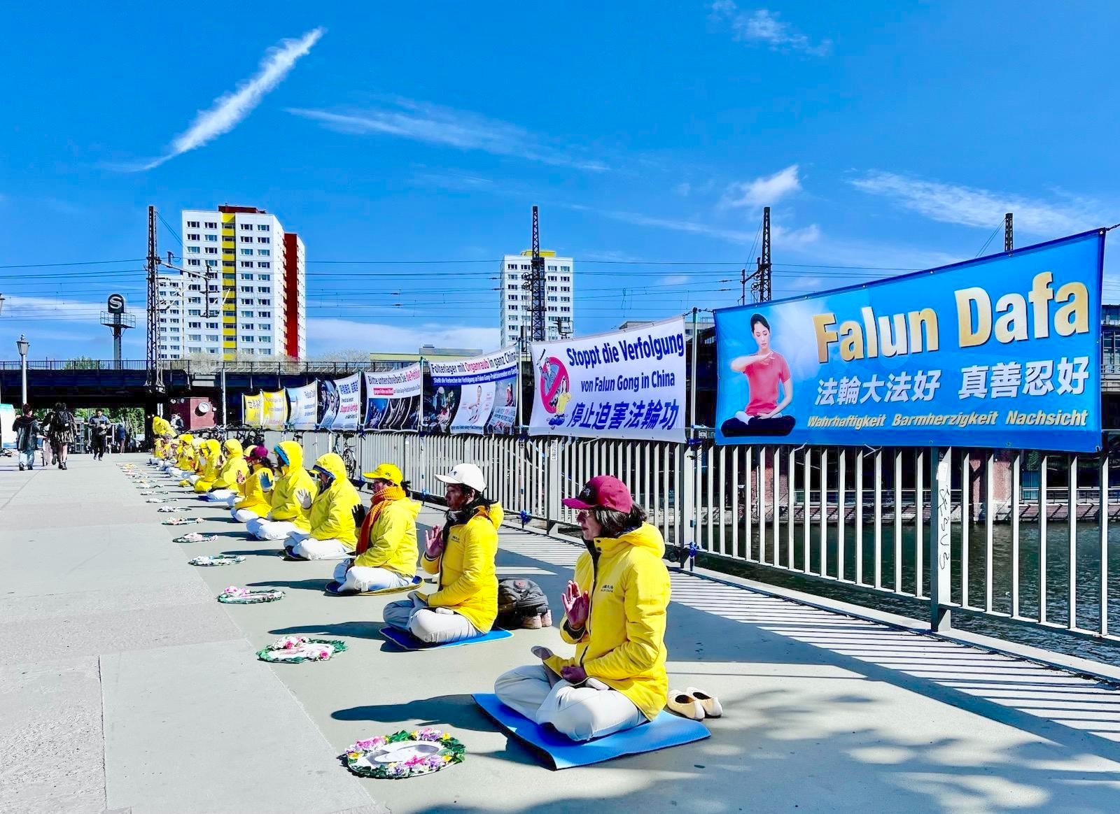 四月二十五日上午,柏林部分法轮功学员在中共大使馆对面的扬诺维茨桥(Jannowitzbrücke)上,举办了和平抗议活动。在大型的横幅写着“世界需要真善忍”、“法轮大法好 真善忍好”以及“呼唤良知 停止迫害”等字样。法轮功学员在桥上展示了功法,向路人发放真相传单,并征集签名反迫害。