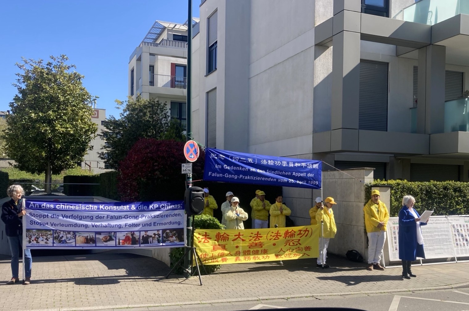 四月二十二日,部分北威州法轮功学员在杜塞尔多夫中领馆前举办活动,呼吁德国社会共同制止中共的迫害。期间,法轮功学员宣读了给中共领馆工作人员的劝善信。