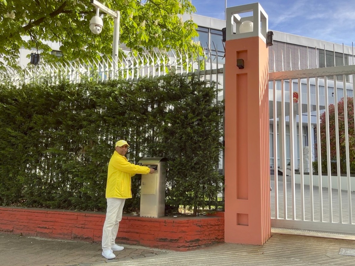 学员还向法兰克福中领馆递交了劝善信。信中讲述了二十七年前四·二五真相,什么是法轮功,为什么中共要迫害法轮功,并希望使馆工作人员不要再听信中共谎言,助纣为虐,早日摆脱中共的束缚。